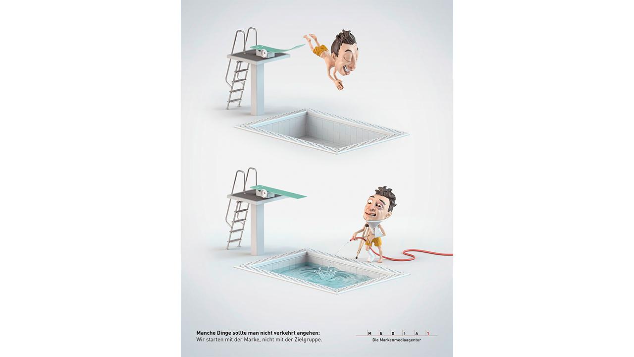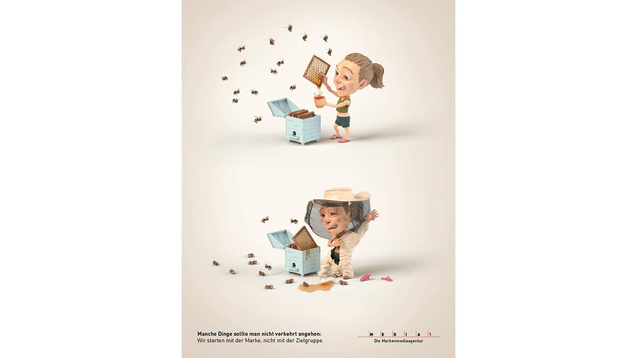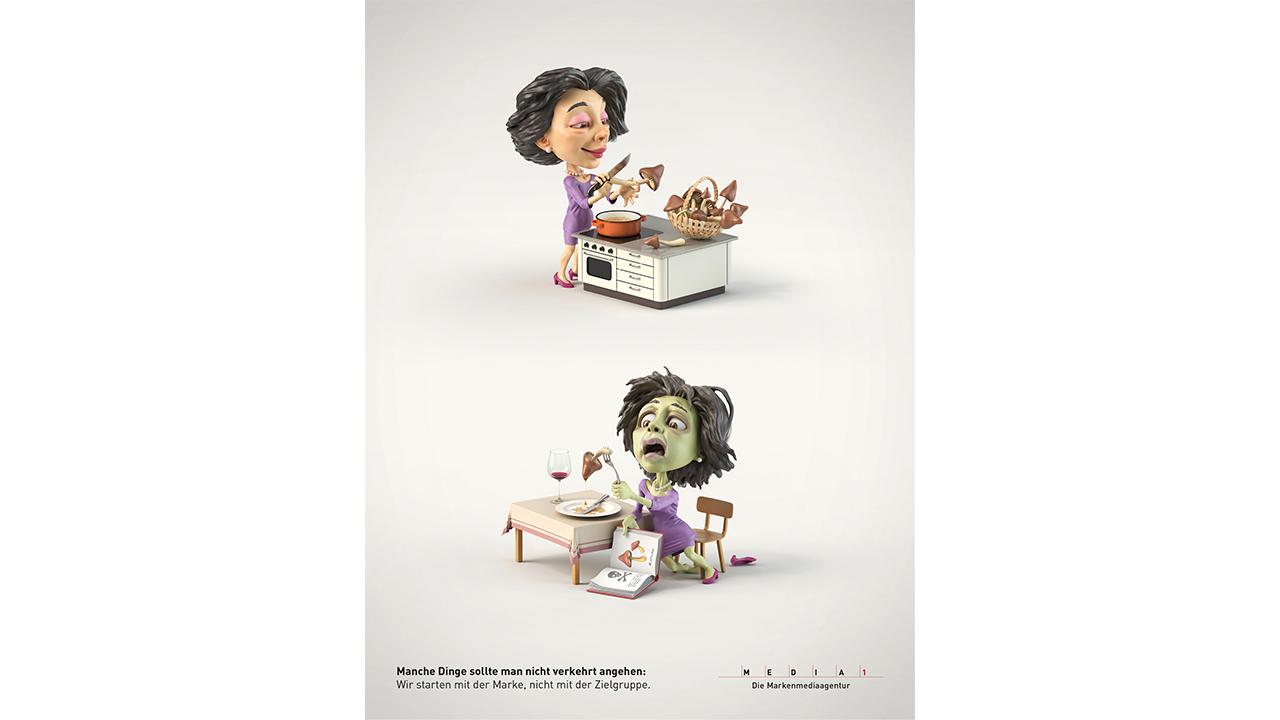 Mediaagenturen haben es gemeinhin schwer sich voneinander abzuheben. Das Alleinstellungsmerkmal der Media 1 ist es nicht beim Budget oder der Zielgruppe, sondern immer bei der Marke zu beginnen. Unser Ziel war es genau das sichtbar zu machen. Um zu zeigen wie wichtig es für Mediaagenturen und ihre Kunden ist bei der Marke zu beginnen, trieben wir den Kerngedanken auf die Spitze. Drei Printsujets zeigen was passiert, wenn man die Dinge verkehrt herum angeht.